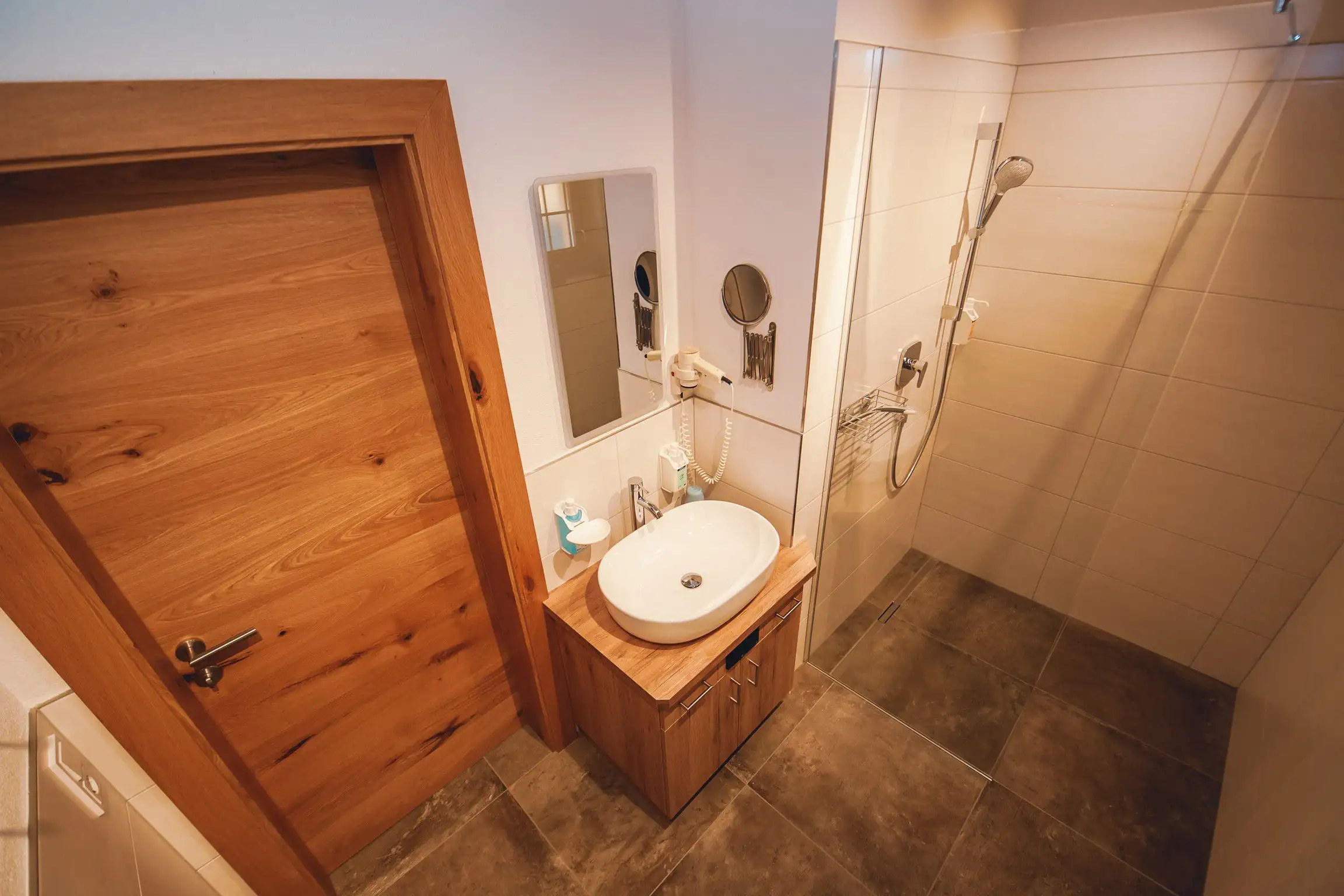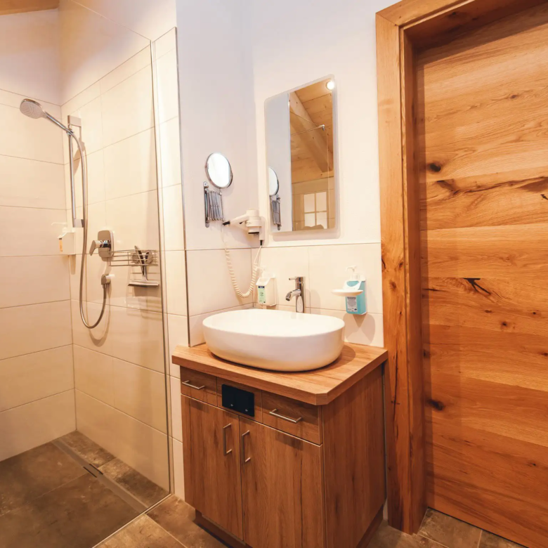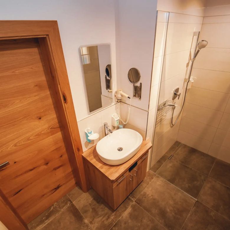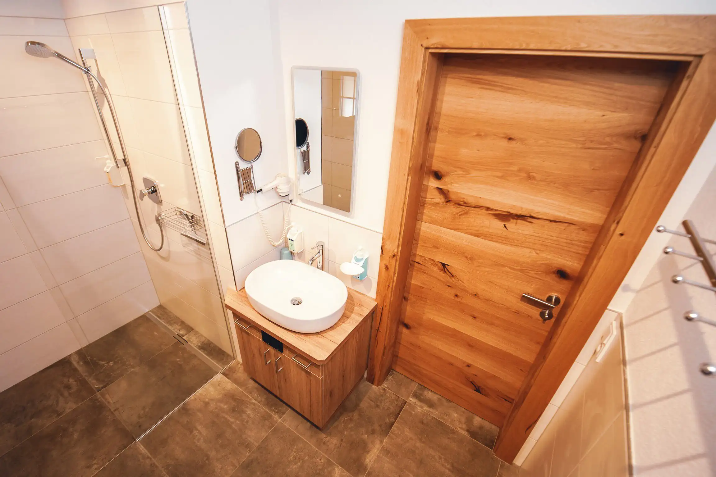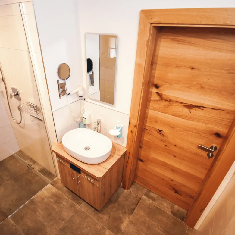 Das neue Badezimmer ist gleich nebenan und dann kommt man in den Salon mit einem alten